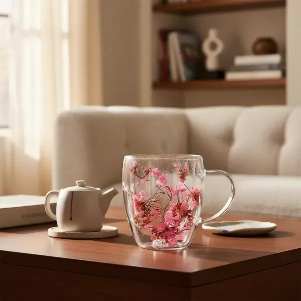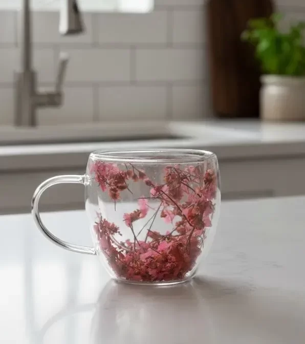 Tazas De Vidrio Doble Pared 250ml y 350ml Con Asa Con Flores Rojas y rosas