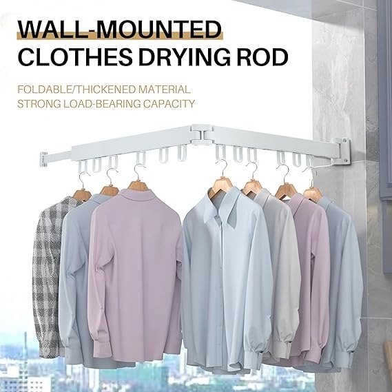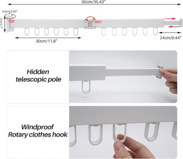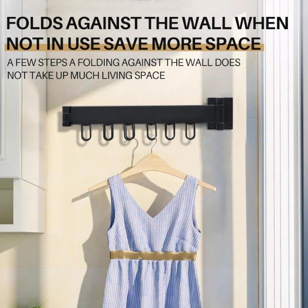12 GANCHOS DE ANILLO: Diseño de gancho de anillo en la parte inferior de la tendedero pared, fijación fuerte; El gancho se puede girar 360 ° para facilitar el almacenamiento de la ropa.