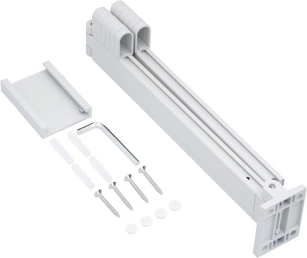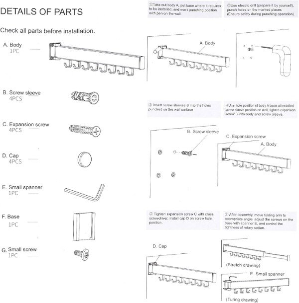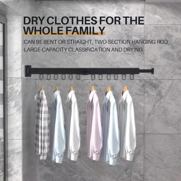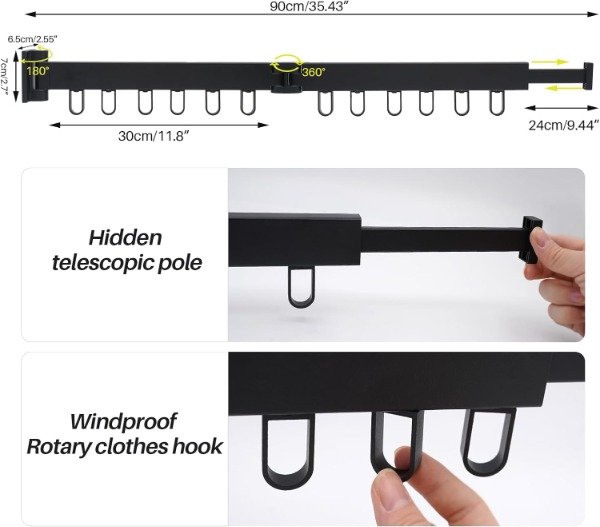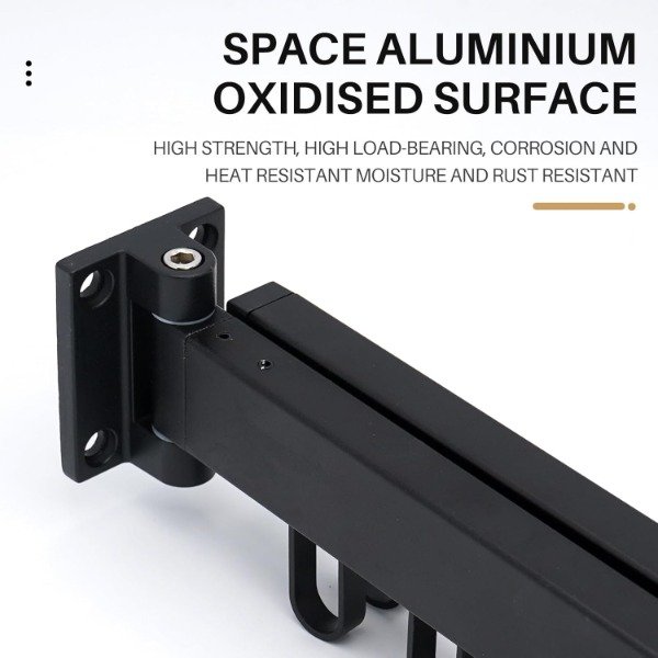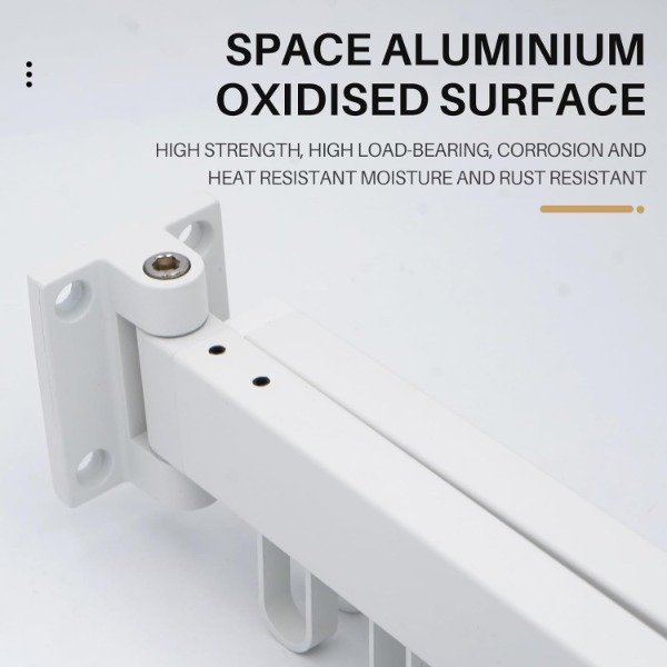 MATERIAL: El bastidor de secado montado en la pared está hecho de material totalmente de aluminio, que no es fácil de oxidar; Método de instalación de perforación, fuerte capacidad de carga, más estable. LONGITUD DESPLEGADA: 90CM;
