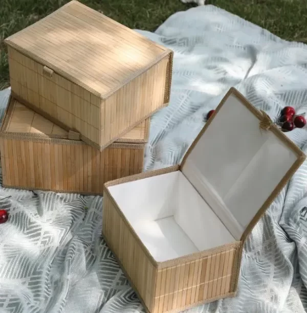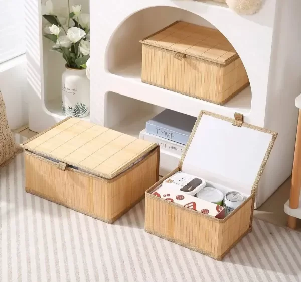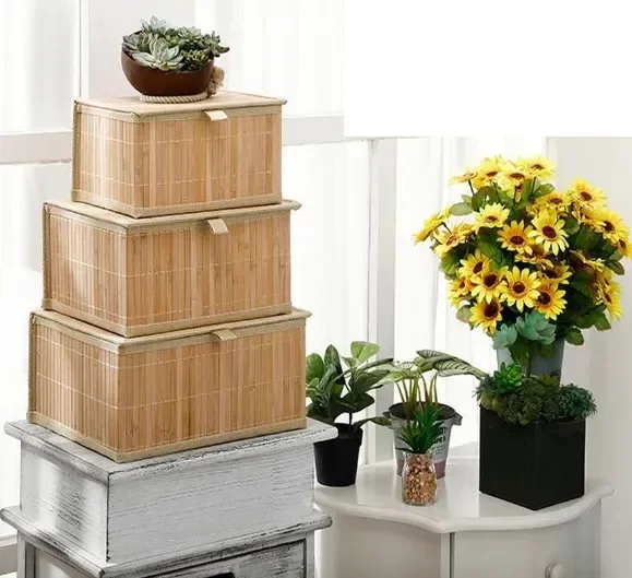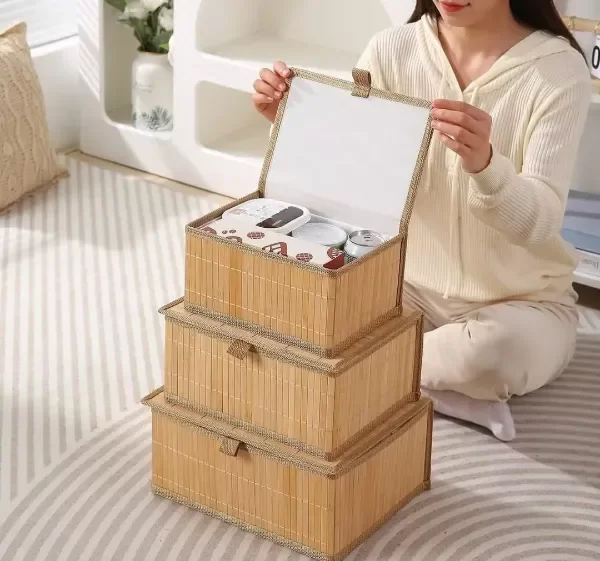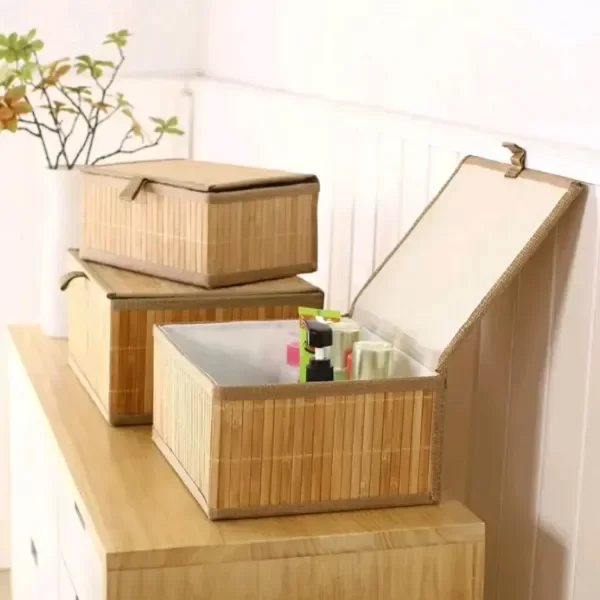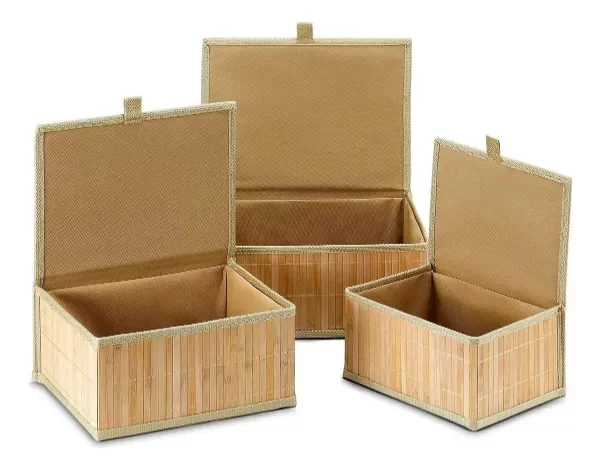 Set X3 Canasto Caja Organizador De Bambú Y Tela Con Tapa Natural