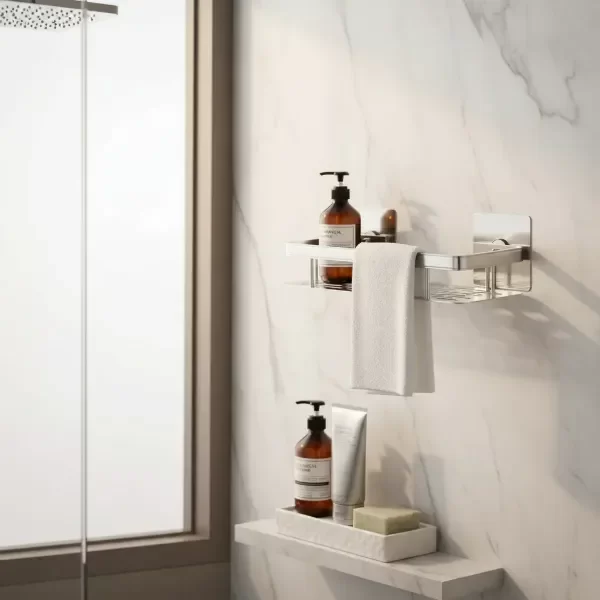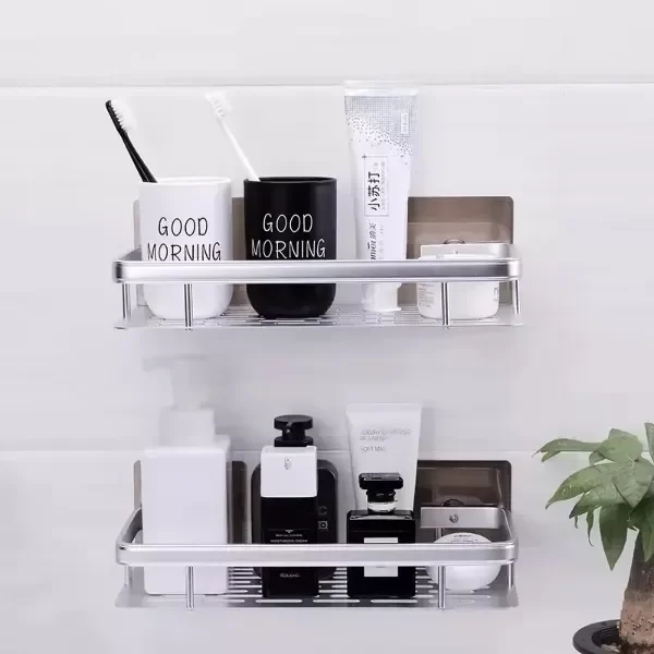 Mantén tu baño o cocina organizados de manera eficiente con nuestro resistente Estante Autoadhesivo de aluminio reforzado.